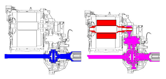 傳統(tǒng)汽車擁有復(fù)雜的齒輪傳動、摩擦離合、換檔等機構(gòu),導(dǎo)致慣量大,系統(tǒng)集成難度大。電動化時代電驅(qū)動系統(tǒng)跟轉(zhuǎn)慣性導(dǎo)致高加速度時的損失大,影響整車效率。如圖所示電驅(qū)系統(tǒng)斷開電驅(qū)傳動系統(tǒng)的跟轉(zhuǎn)和保留跟轉(zhuǎn)所帶來的拖滯轉(zhuǎn)矩的對比如圖14 ,可見隨著驅(qū)動電機功率與轉(zhuǎn)速的不斷提高,跟轉(zhuǎn)損失會越來越大,系統(tǒng)效率變低。另外電動汽車的傳動系統(tǒng)既要在驅(qū)動時出力,在制動能量回收時也要承受電制動載荷,傳動鏈受載更為復(fù)雜。