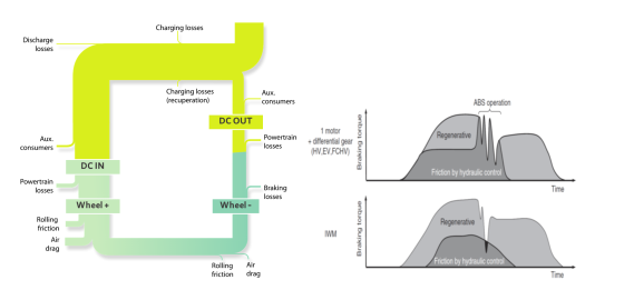 麥迪克自動輪采用驅(qū)制動一體化技術(shù),充分發(fā)揮輪轂電機高強度能量回收制動功能,將傳統(tǒng)由摩擦制動為主變?yōu)橐噪娭苿訛橹?并輔以摩擦制動以過載方式完成全制動能力以保持制動系統(tǒng)全冗余功能。實現(xiàn)電池能量與車輪能量的循環(huán)利用如圖20所示,大幅提高能效與線控制動安全性。
